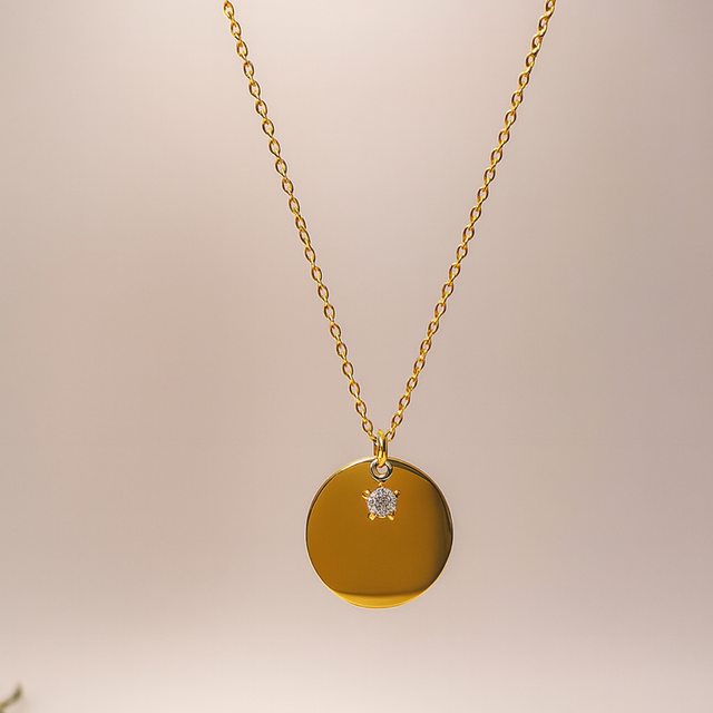 Médaillon rond en acier doré, poli effet miroir, rehaussé d’un strass lumineux et monté sur une chaîne fine et délicate.