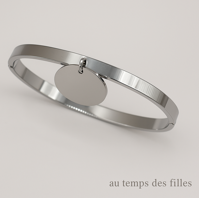 Bracelet jonc en acier inoxydable argenté, orné d’un médaillon rond lisse à personnaliser.
